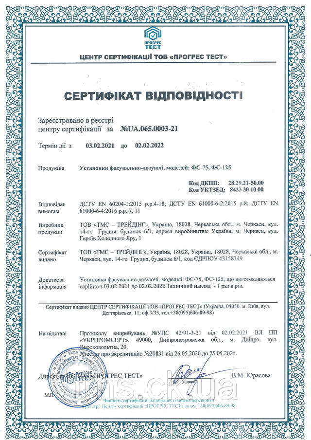 Компанія "ТехноМашСтрой" пройшла процес сертифікування продукції та отримала сертифікати відповідності "УкрСЕПРО", європейський сертифікат відповідності "СЕ", а також відповідність продукції міжнародному стандарту ISO 9001.